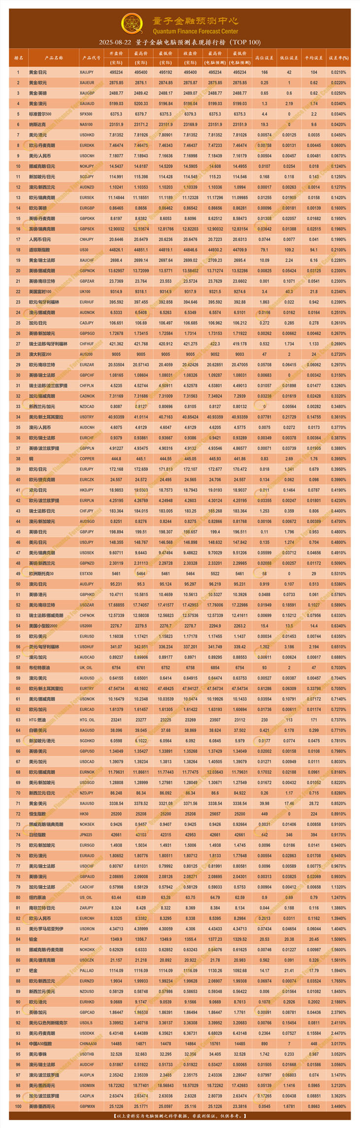 2025-08-22 量子金融电脑预测表现排行榜