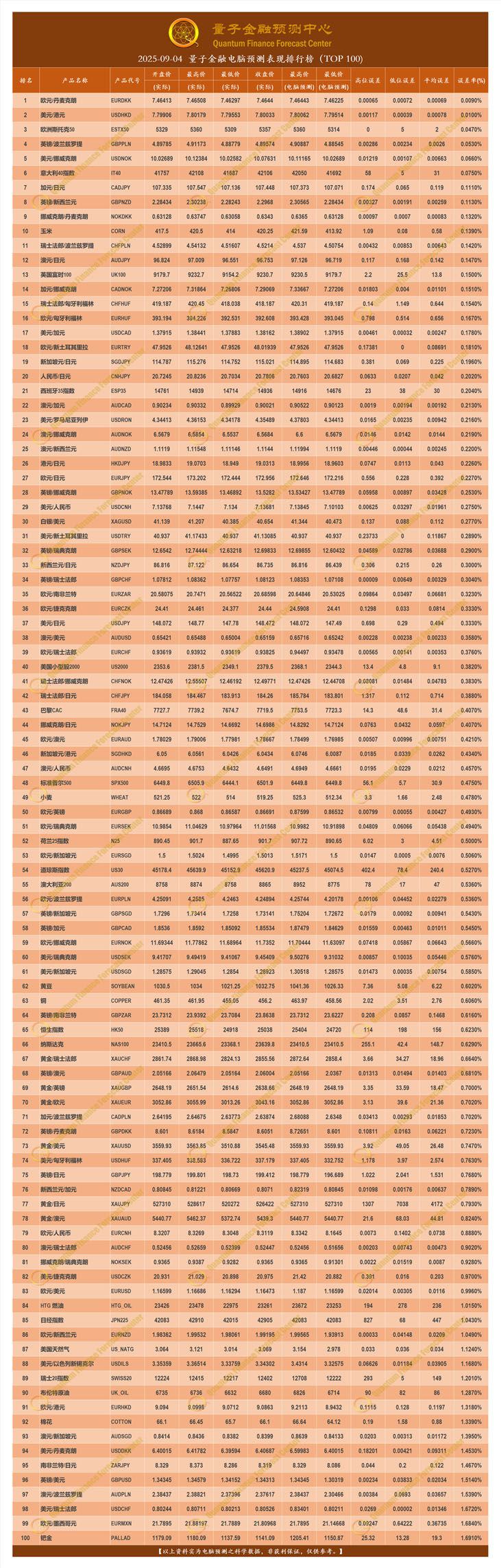 2025-09-04 量子金融电脑预测表现排行榜