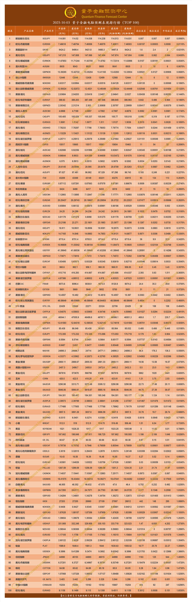 2025-10-03 量子金融电脑预测表现排行榜