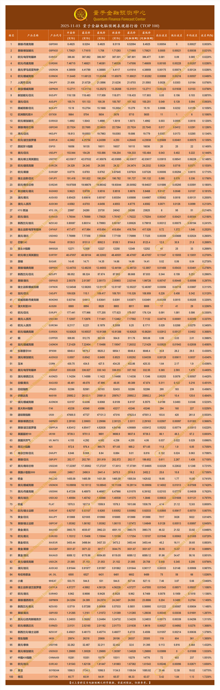 2025-11-03 量子金融电脑预测表现排行榜