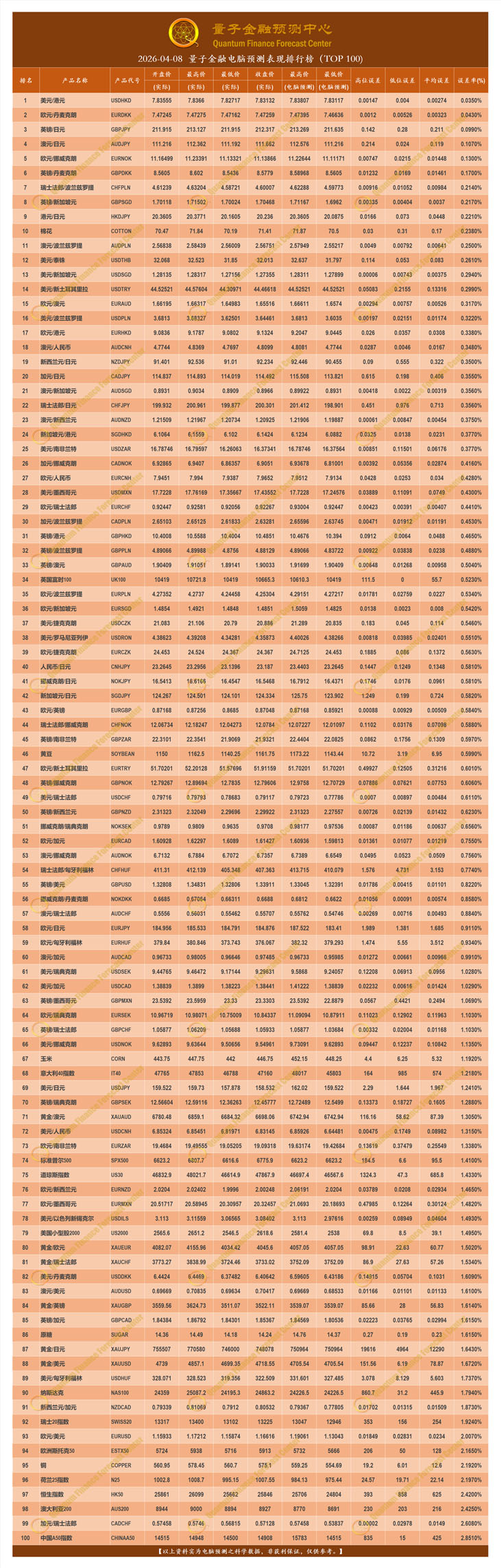 2026-04-08 量子金融电脑预测表现排行榜