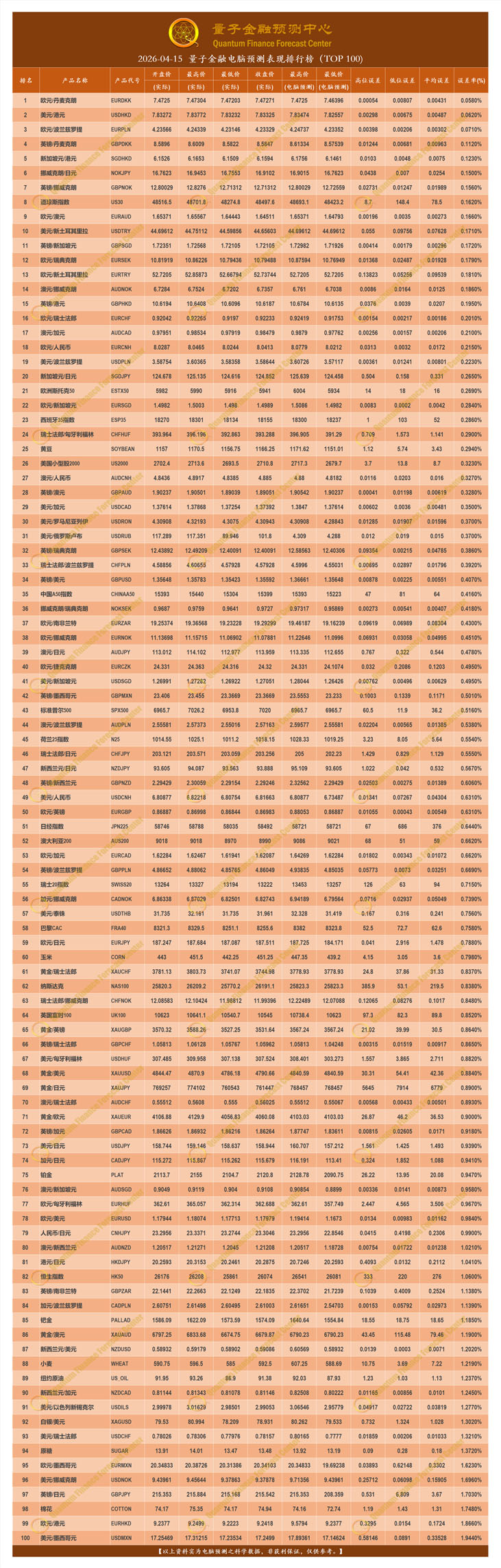 2026-04-15 量子金融电脑预测表现排行榜